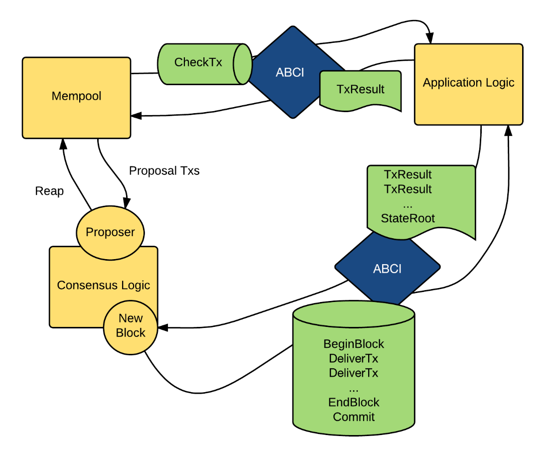 3곳이라고 했는데, 막상 그림에서는 ABCI가 2곳밖에 없다. Mempool과 Consensus Logic사이에 ABCI가 하나 더 있어야 할 것 같지만, 다시금 되새겨보자면, ABCI는 Application과 Consensus Engine사이의 Interface이다.