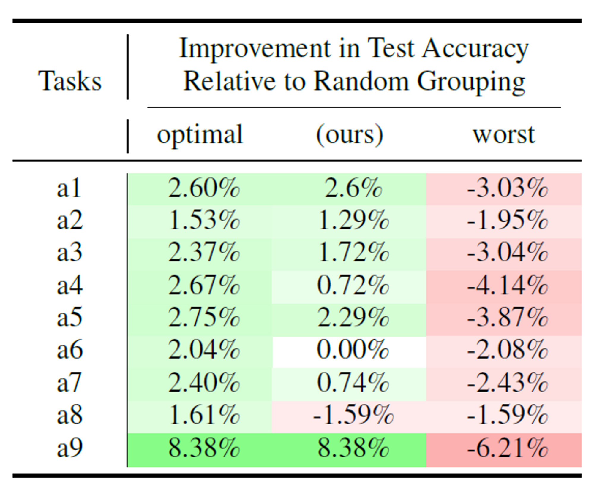 a8이 exception으로 나타나는데, 이는 theoritical analysis에서 나왔던 것처럼 inter task affinity의 차이가 크지 않은 경우이기에 이런 Limitation이 나타나게 되었다.