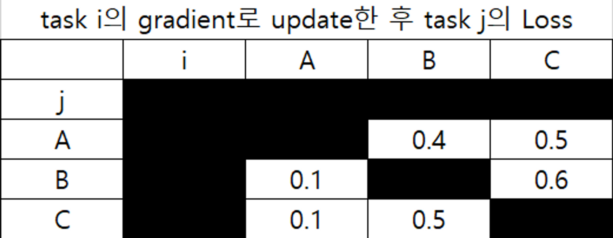 수치화시키기 위한 아이디어는 MAML[5]에서 가져오게 되었는데, 간단하게 설명하자면, 전체 Task Tτi의 Gradient로 업데이트한 파라미터를 이용해서 τj를 평가해서 수치화하는 것이다.